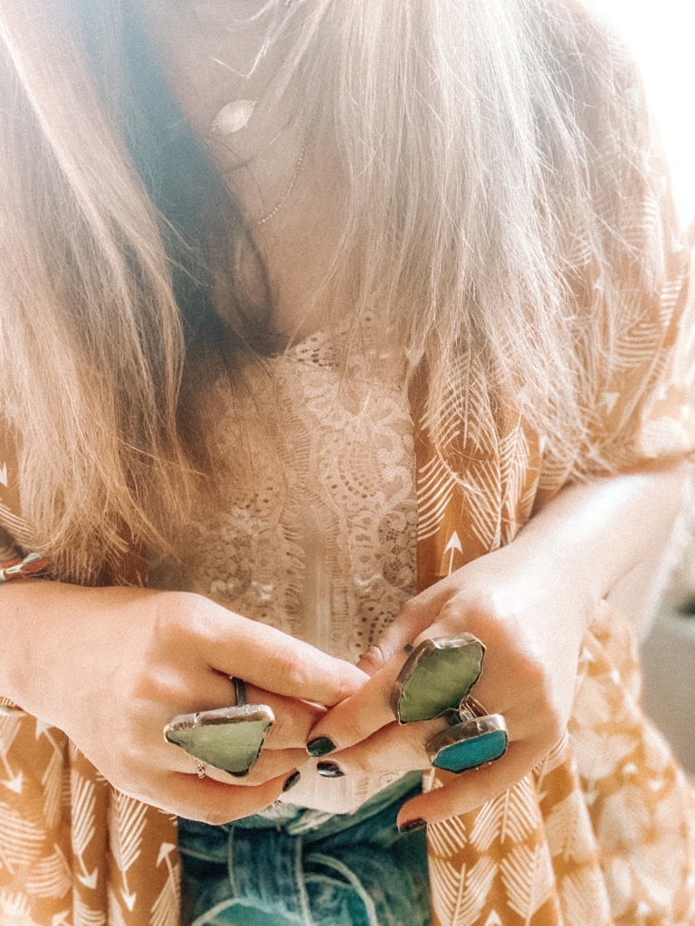 Golden hour in the Take The Long Way Home kimono and Wander & Wave rings from Fullfeatherramble 💫 • • #handmadejewelry#handmadefashion#slowfashionmovement#bohostyle#hippievibes#tumbledbythesea#seaglassjewelry#eclecticstyle#70sstyle#stylist#styleblogger#madeincanada#ontariosmallbusiness#fullfeatherramble